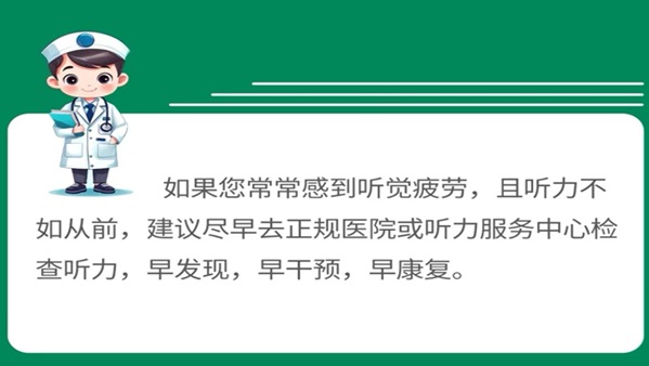 如果您常常感到听觉疲劳,且听力不如从前,建议尽早去正规医院或听力服务中心检查听力,早发现,早干预,早康复。科学爱耳,共护听力健康。