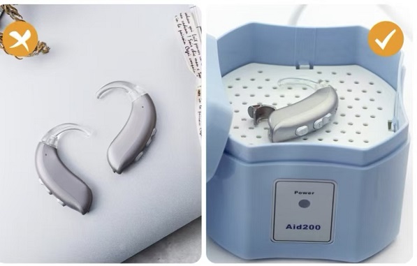 每晚取下助听器后,务必打开电池仓仓门,放入专用的电子干燥器或使用物理干燥剂。