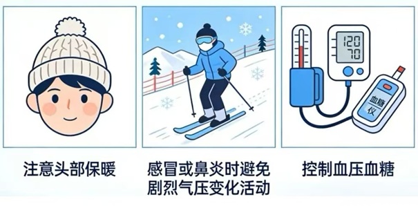 高速滑雪、登山时的快速升降,会导致中耳内外气压失衡。如果咽鼓管功能不佳(如感冒时),可能引发航空性中耳炎,出现耳痛、耳闷和暂时性听力下降。