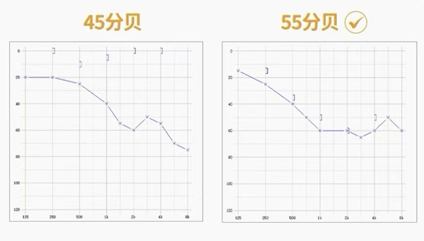 ①假如双侧听力损失都在60分贝以下,一侧45分贝,一侧55分贝,那么优先选配55分贝的那侧。这是因为相对来说,55分贝的那一侧更需要听力的补偿,而45分贝的那侧,即使是裸耳也能获得相对较好的听力。
