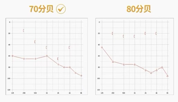 ②假如双侧听力损失都在60分贝以上,比如一侧70分贝,另一侧80分贝,那么建议优先选配70分贝那侧。可能有些听友对这个选择存在一定的疑惑,为什么差的耳朵不戴助听器,反而是好的耳朵戴呢?这是因为相对来说,70分贝那侧佩戴上助听器带来的效果会好于80分贝那侧,如果只能佩戴一个,我们会选择效果更佳,能为患者带来更多好处的那侧。
